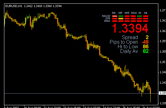 It shows levels of EMA, STR and MACD od multiple timeframes. It also shows current price and spread.