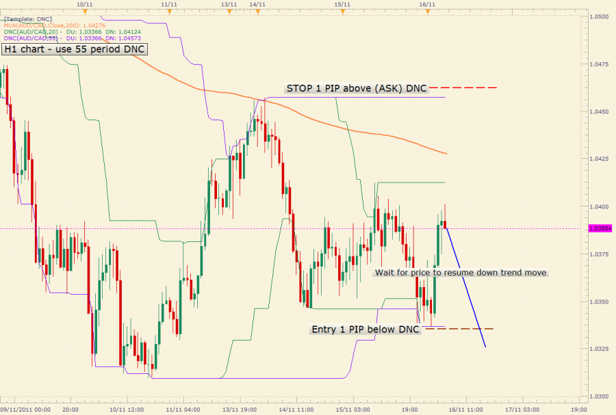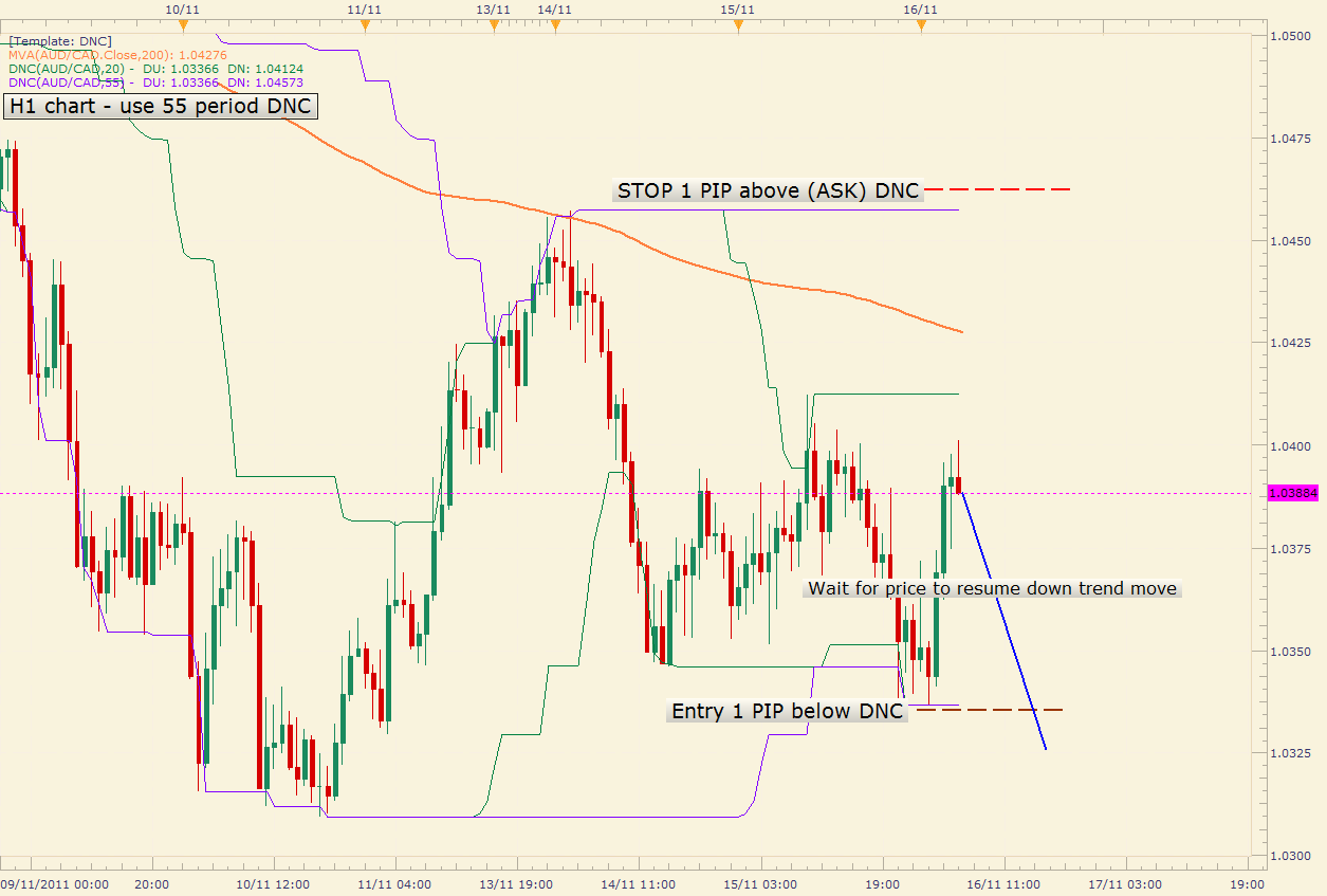 After a retrace, set up an entry order on a break below the lower DNC line (1-5 PIPs below the indicated previous low.).