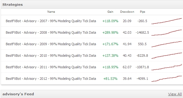 Please view 2007 - 2013 Strategy test at Myfxbook for verfication - http://www.myfxbook.com/members/advisory