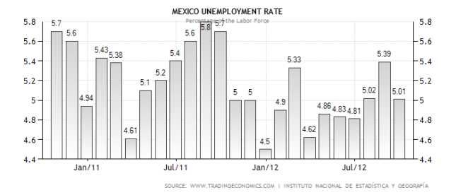 Mexico unemployment rate was recorded at 5.01 in September of 2012.Historically from 2000 until 2012; Mexico unemployment rate averaged 3.67 percent reaching in all time high of 5.93% in May of 2009 and record low of 2.22% in November of 2002.