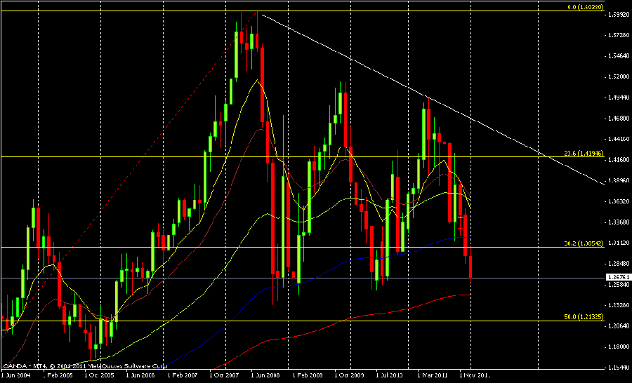 Looking at the monthly chart, it seems that EurUsd is still in a bearish trend. Fundamental analyis is in synched with technical analysis. Our team is looking at 200 ema as support (red line on the chart) around 1.2450. If more bad news comes out of Eurozone and more good news comes out of the US in the following weeks, then the support at 1.2450 will be tested with high probability. If that breaks, then we are projecting that price will reach the 50% fib retracement at 1.2135 which is our next support level. On the upside, we are looking at the 1.3050 (38.2% Fib) level as resistance.
