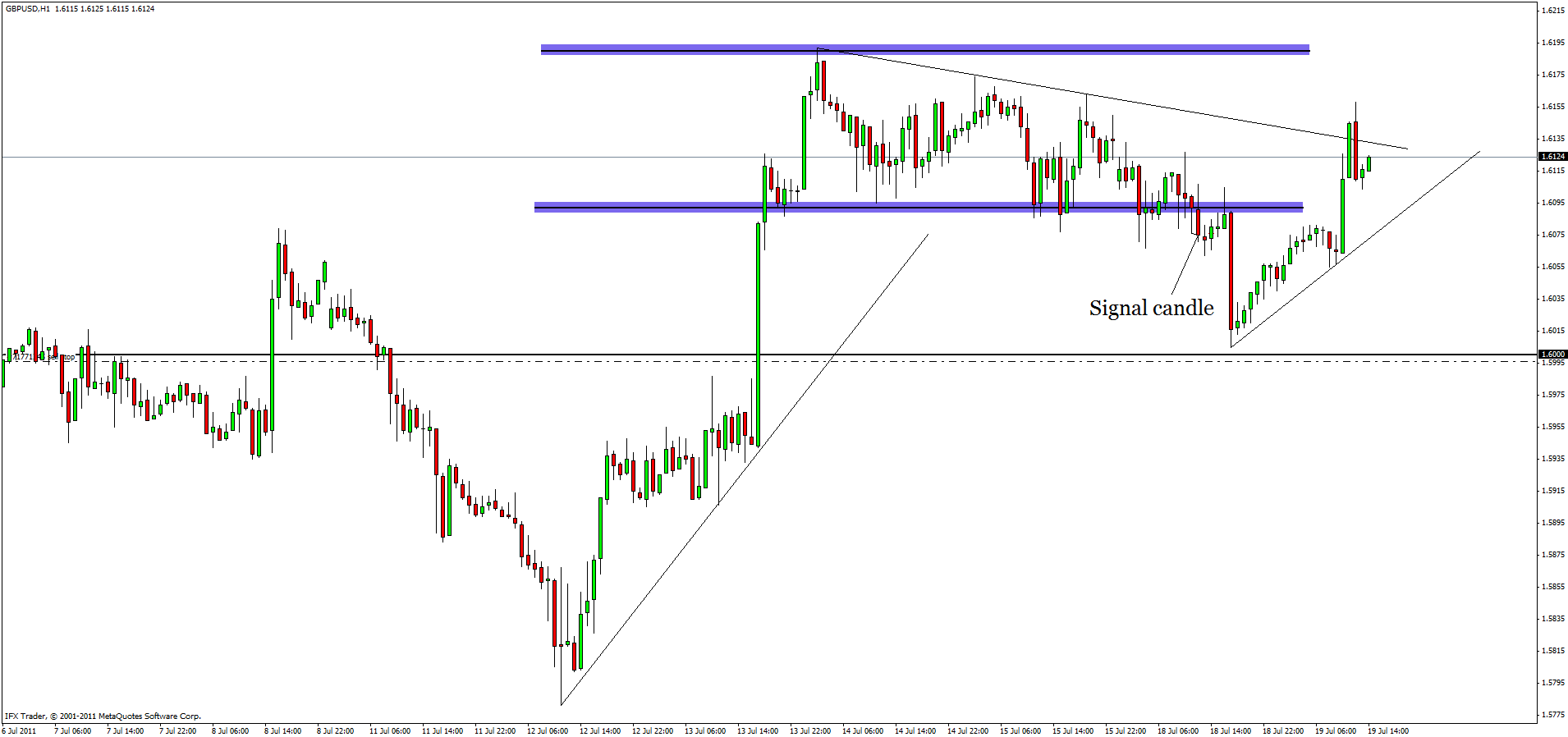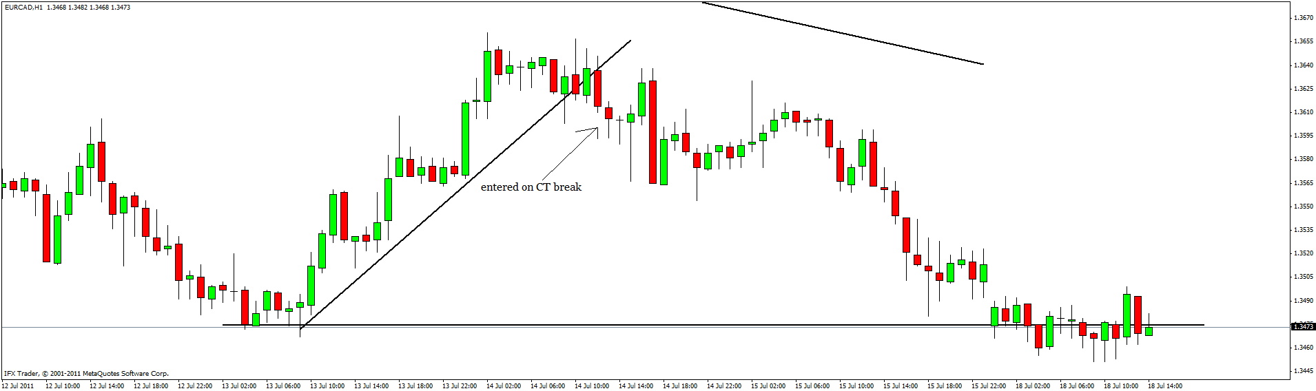 1. There is a trend. Within this trend, countertrend forms. As soon as this countertrend breaks with a H1 candle or enough pips, I enter. Stoploss is at the last high/low, or at the top of the signal candle + 5 pips.
